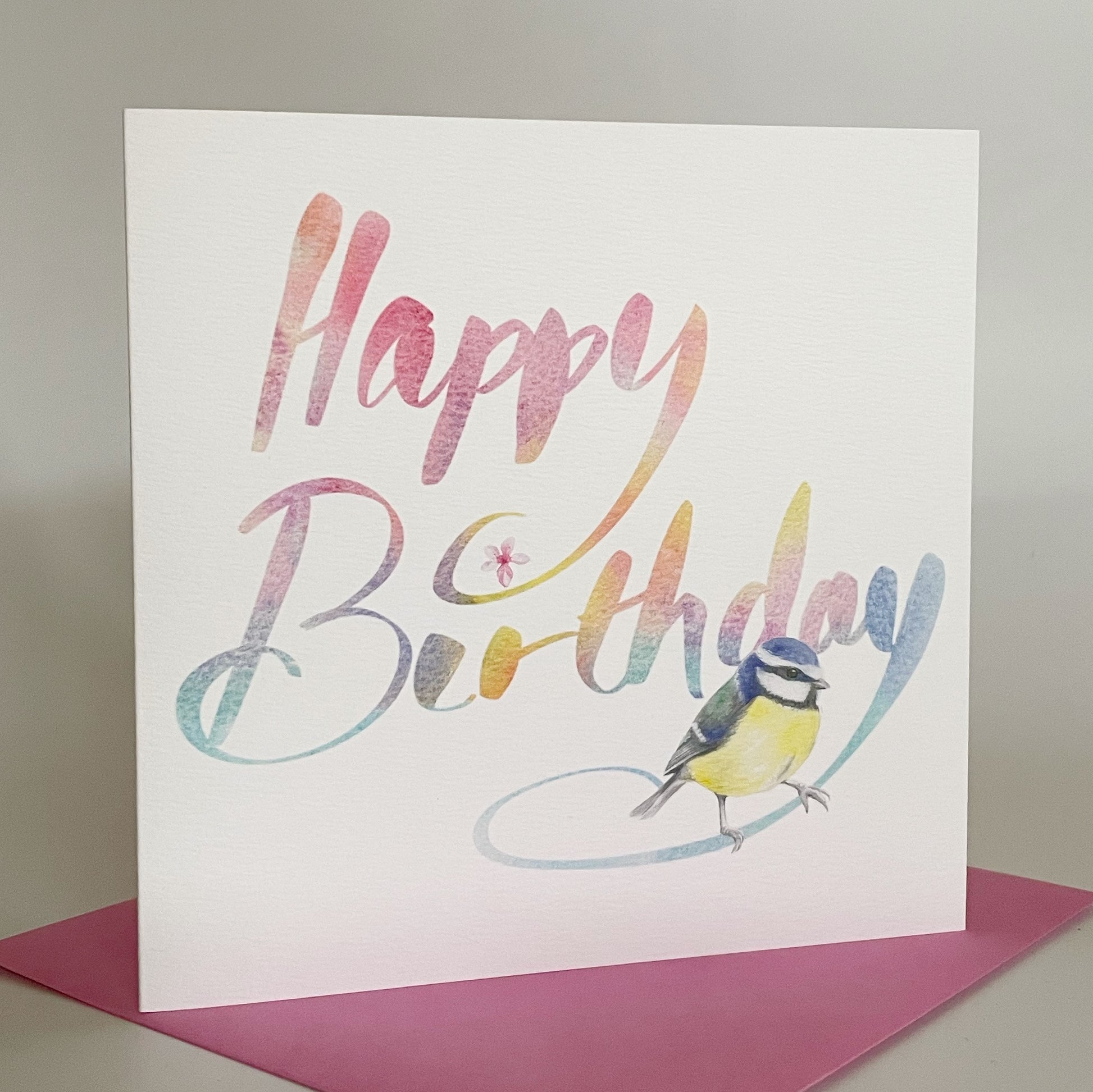 One of the most popular birds in the UK this colourful chap is perched on an even more colourful birthday wish.