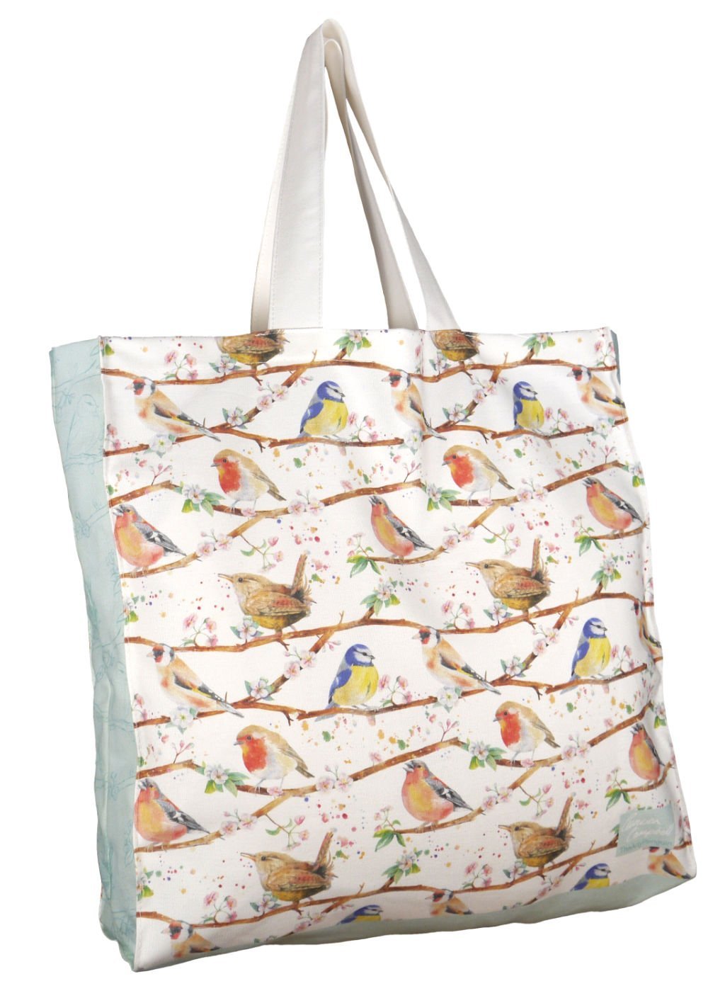 Quality cotton canvas shopping tote bag with beautiful watercolour illustrations of blue tits, robins, wrens and finches in cherry blossom branches. Contrast line drawing gusset and sides.
