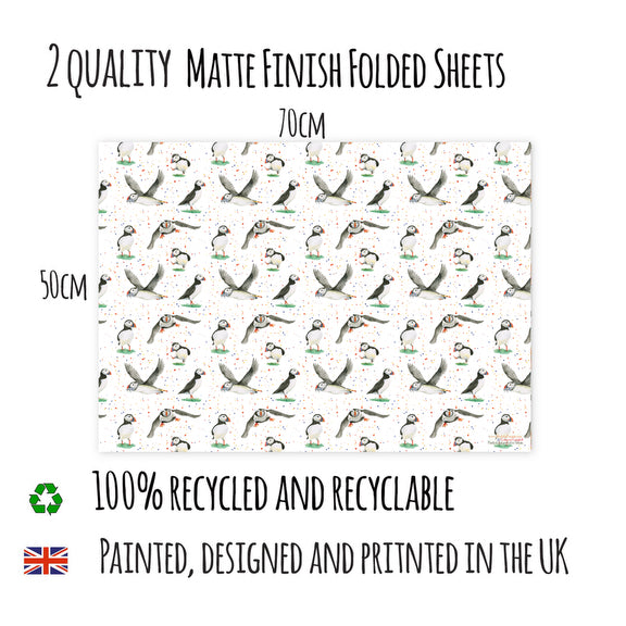 2 sheets of gift wrapping paper with completely matte finish, each 50cm x 70 cm and folded for postage. Includes 2 co-ordinating tags.