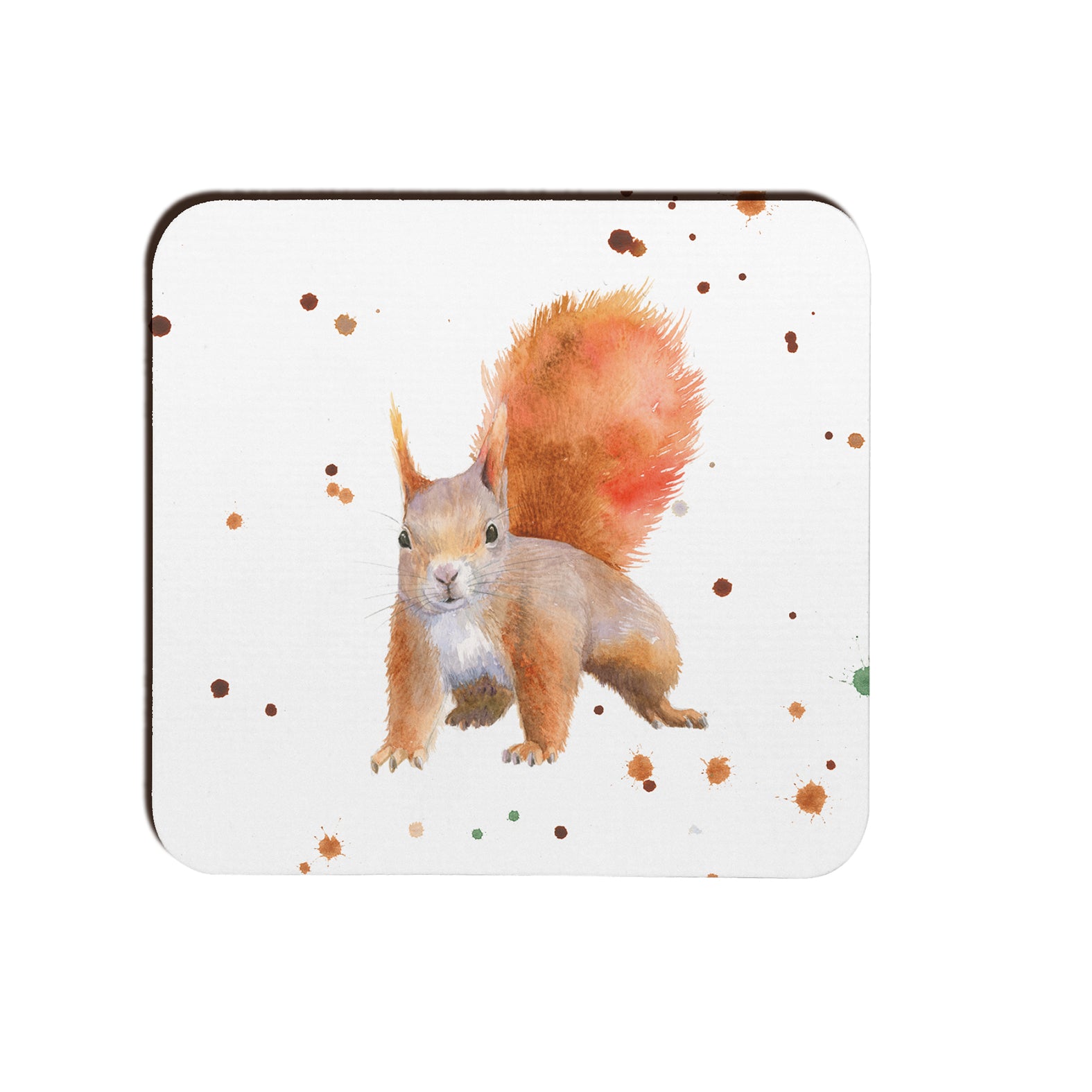 Solid melamine coaster with watercolour painting of a Britains beautiful endangered Red Squirrel. 10cm square with black rubber backing. Made in Britain.