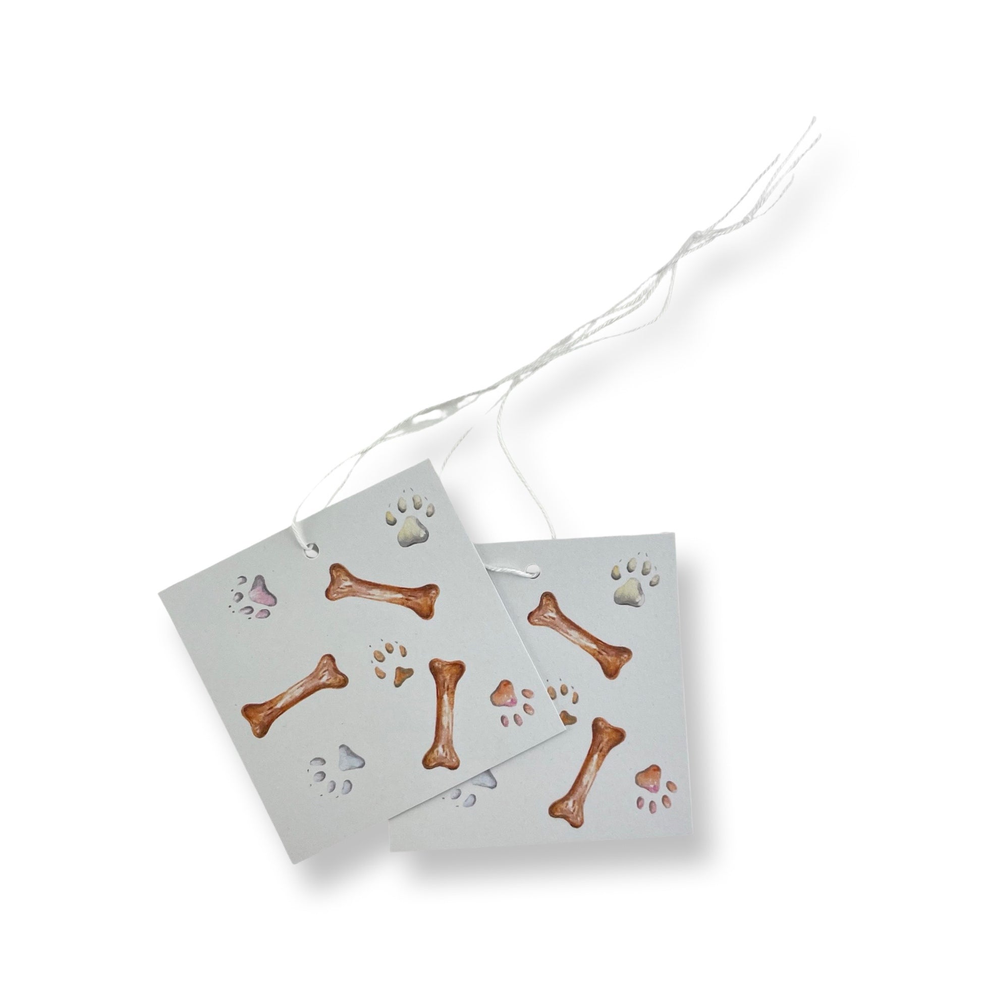 2 sheets of recycled and recyclable gift wrapping paper with matte finish, each 50cm x 70 cm and folded for postage.  Includes 2 co-ordinating gravy bone and paw print gift tags.